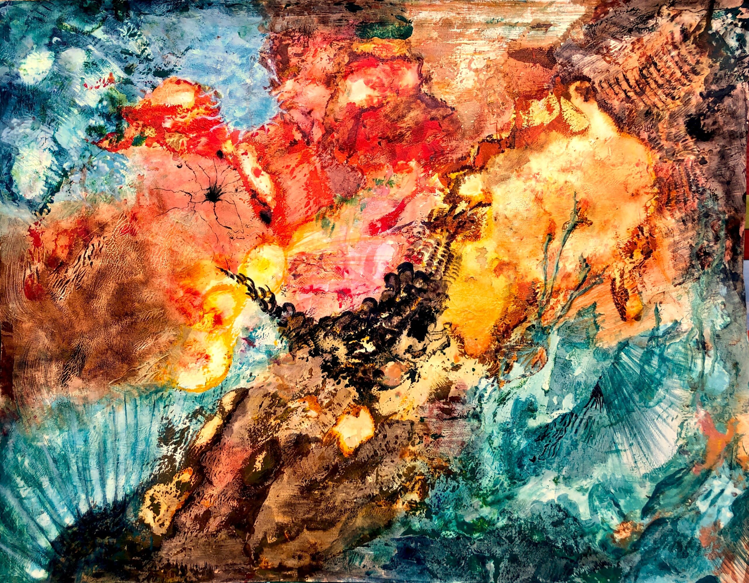 Cette peinture est une œuvre qui évoque un fond marin. La transparence des couleurs donnent fluidité et mouvements aux formes enchevêtrées de marron et d’orange qui sont représentées dans la composition. Les couleurs marron et orange apportent une touche de chaleur et de profondeur à l’ensemble de cette représentation abyssale peuplée d’organismes vivants et mouvants.