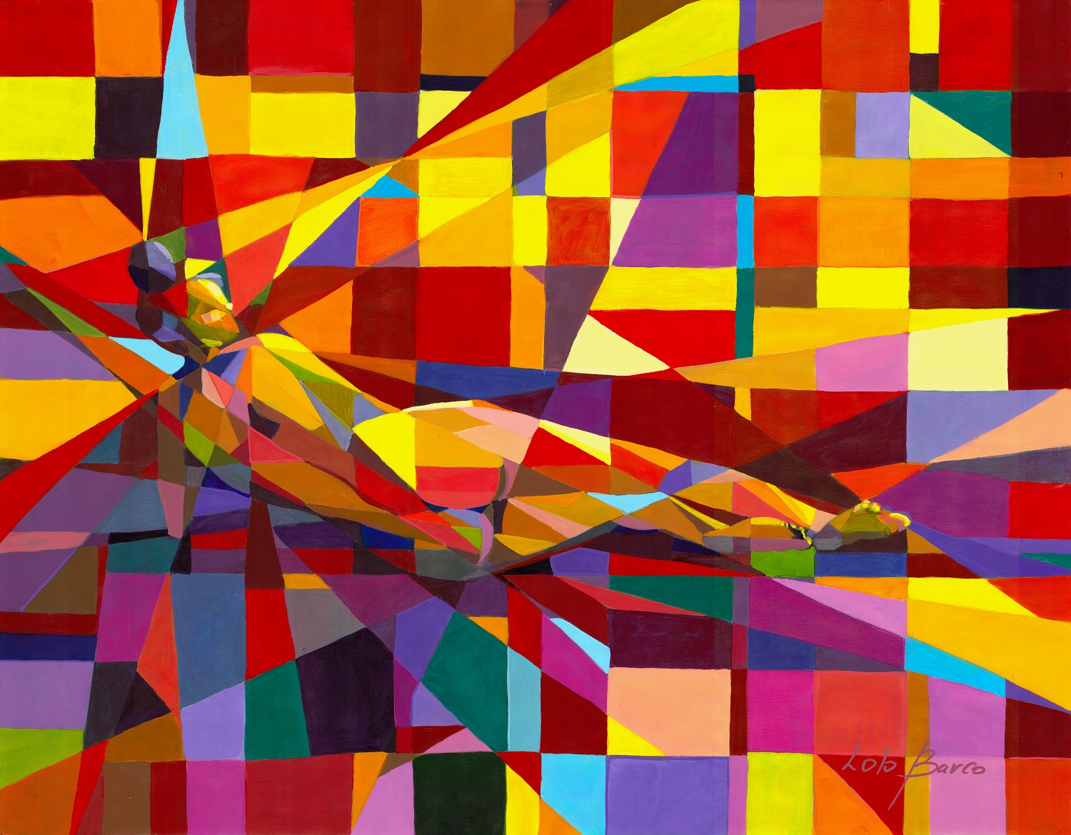 Cette peinture aux formes géométriques crée une composition complexe qui attire immédiatement l’attention. La partie supérieure de l’œuvre est illuminée par des couleurs pures et vives, qui ajoutent une dimension supplémentaire de profondeur et de luminosité. Les couleurs, dominantes et lumineuses, donnent vie à l’ensemble de l’œuvre, créant une atmosphère lumineuse et enveloppante. La représentation d’un corps de femme, faite de couleurs vives et chatoyantes, se détache de la partie inférieure aux tons plus rabattus, donnant une impression de profondeur. L’utilisation de couleurs contrastantes crée une dynamique visuelle qui capte l’attention de l’observateur et l’entraîne dans mon univers. C’est une œuvre qui invite à la contemplation et à l’exploration de ses nombreux détails et de ses subtilités.